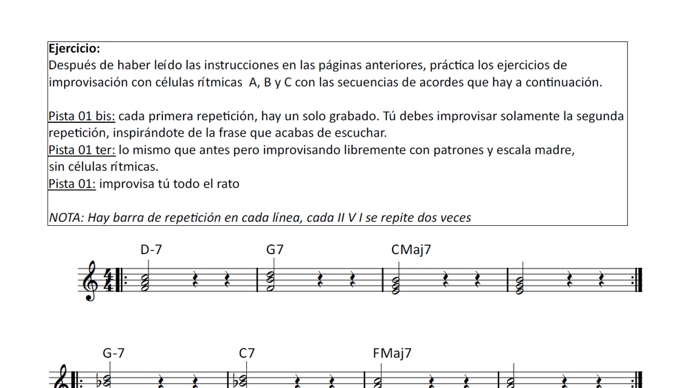 - El ejercicio “improvisa conmigo” para improvisar libremente sin perderse en 7 tipos de II-V-I diferentes.