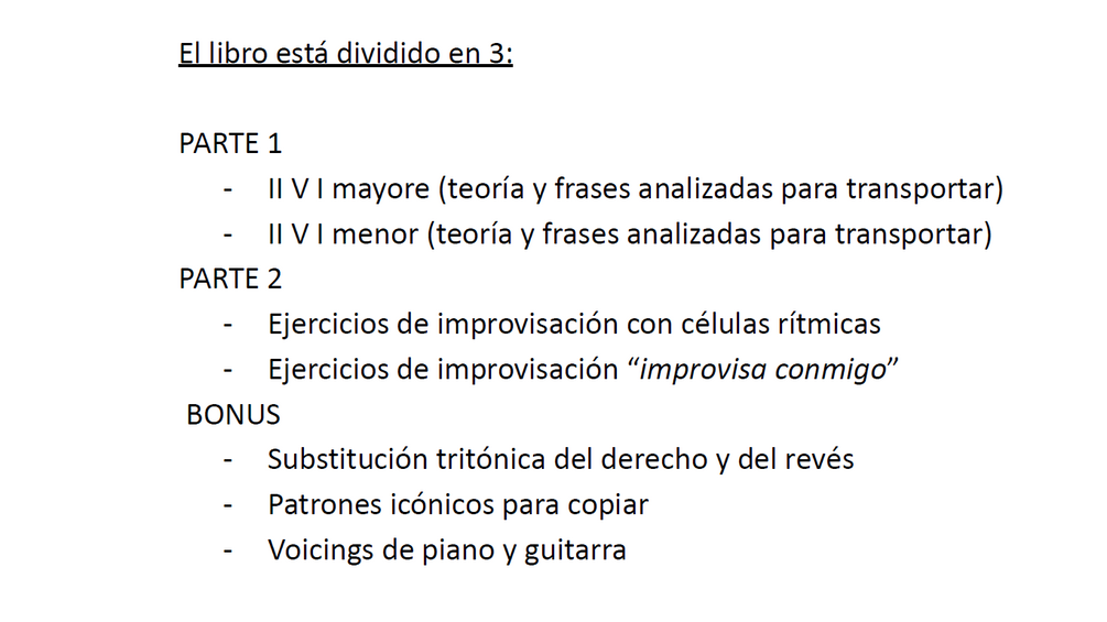 • El ejercicio “improvisa conmigo” para improvisar libremente sin perderse en 7 tipos de II-V-I diferentes.